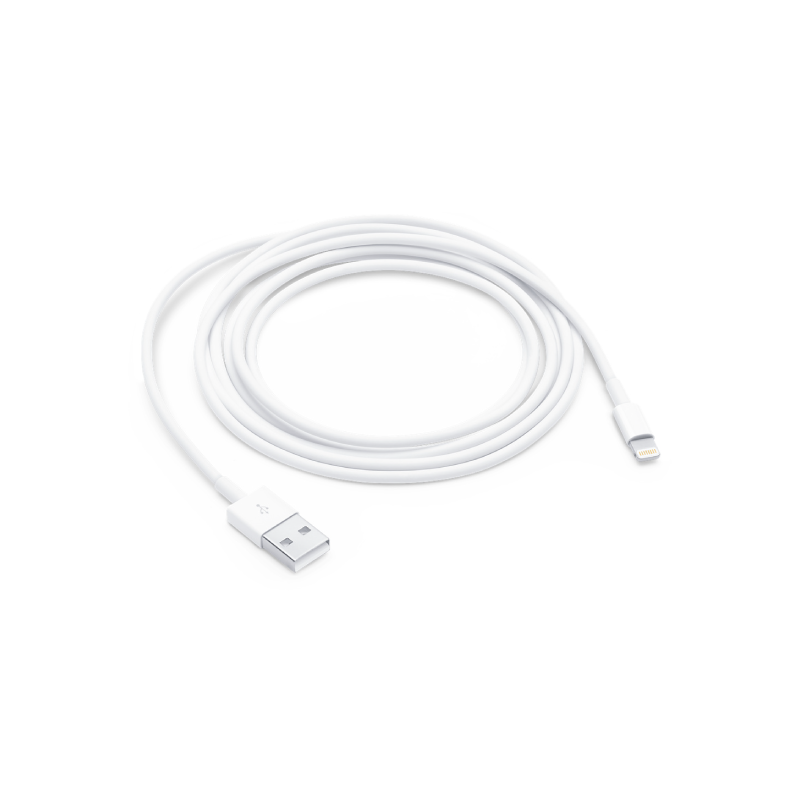 Este cabo USB 2.0 liga o iPhone, iPad ou iPod com conetor Lightning à porta USB do computador para o sincronizar e carregar, ou ao Adaptador de corrente USB Apple para o carregar numa tomada.